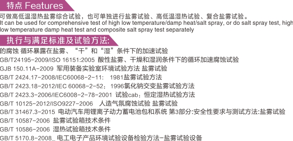 设备主要用于金属材料、航空器材及船舶配件等实验室加速模拟海洋气候条件测试,设备内箱由具有耐腐蚀性的纯钛板制作,外箱采用不锈钢板烤漆制作;保温层采用玻璃纤维棉+聚氨酯硬质发泡胶制作,具有极佳耐腐蚀性能和保温性能。设备具有高温、低温、湿热、干燥、盐水喷雾等多个功能,可实现自动循环控制或单一功能控制,操作简单,数据化管理。控制系统采用西门子PLC+西门子温度模块+人机界面制作而成,自主开发控制系统,可实现手机APP远程操作控制、USB接口可连接U盘记录试验室数据,可连接以太网实现多台设备同步控制。The equipment is mainly used for accelerating the test of simulated ocean climate conditions in laboratories of metal materials, aviation equipment and ship accessories. The inner case of the equipment is made of pure titanium plate with corrosion resistance, and the outer case is made of stainless steel baking paint. The insulation layer is made of glass fiber cotton + polyurethane rigid foam rubber, which has excellent corrosion resistance and good corrosion resistance. Thermal insulation performance. The equipment has many functions such as high temperature, low temperature, damp heat, drying, salt spray and so on. It can realize automatic circulation control or single function control, simple operation and data management. The control system is made of Siemens PLC+Siemens Temperature Module+Man-Machine Interface. The self-developed control system can realize the remote operation control of mobiles APP, USB interface can connect U disk to record laboratory data, and Ethernet can be connected to realize synchronous control of multiple devices.