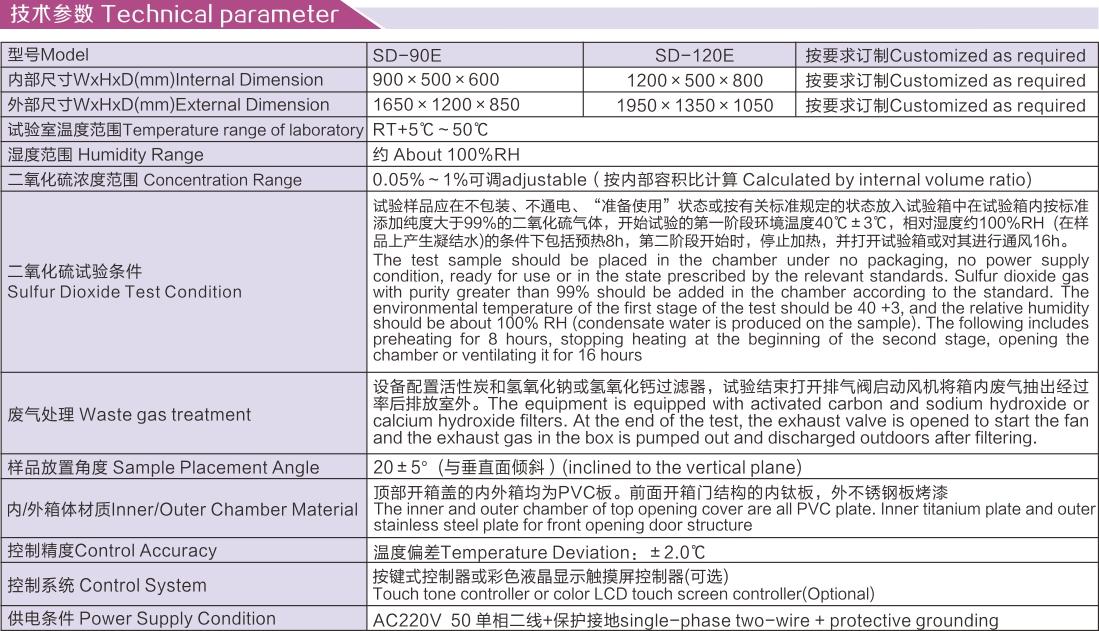 本设备用于模拟样品在含有二氧化硫大气环境下的冷凝水-交变气候中的试验的常规条件,实现了对在不同实验室里所得出的试验结果进行比较的可行性,也可以起到快速找出问题所在的作用。