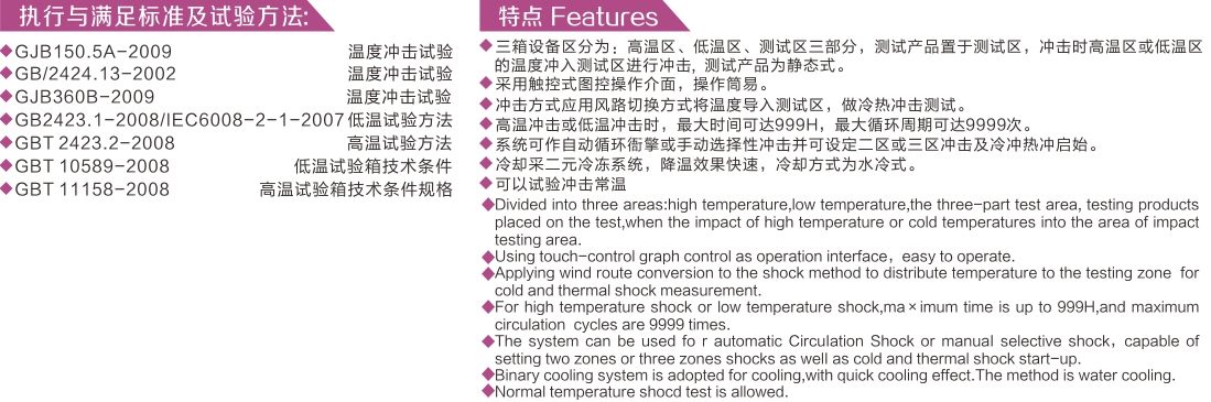 冷热冲击试验机,用来测试材料结构或复合材料,在瞬间下经极高温及极低温的连续环境下所能忍受的程度,藉以在最短时间内试验其热胀冷缩所引起的化学变化或物理伤害。适用的对象包括锂电池、金属、塑料、橡胶、电子等材料,可作为其产品改进的依据或参考。Thermal Shock Chamber is used to test the capability of material structure or composite materials to withstand the continuous environmental changes between extremely high temperature and low temperatures during a short period, and therefore understand the chemical changes or physical damages caused by expansion from heat and contraction from cold in the shortest possible time. It is applicable to Lithium-ion battery,metals, plastic, rubber, electronics amongst other ,Lithium-ion battery. The test result can be used as a reference or basis for product improvement.