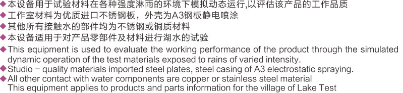 本设备用于试验材料在各种强度淋雨的环境下模拟动态运行以评估该产品的工作品质;