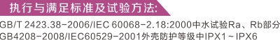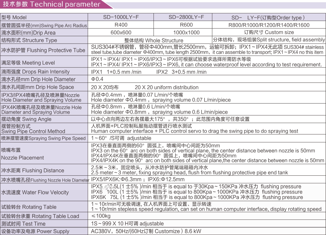 本试验适用于产品在运输、贮存或使用期间可能遭受不同的环境温度下冲水,这些水来源于大暴雨、风吹大雨、洒水系统、车轮溅水、冲水或猛烈海浪等条件下检验其产品性能指针及质量管理用。The test is used for electric product which may suffer flushing under different environmental temperature during transportation, storage or usage, this rain comes from heavy rain,wind brew rain, water sprinkler system,wheel splash, flush water or violent waves. In order to check product performance index and quality management.